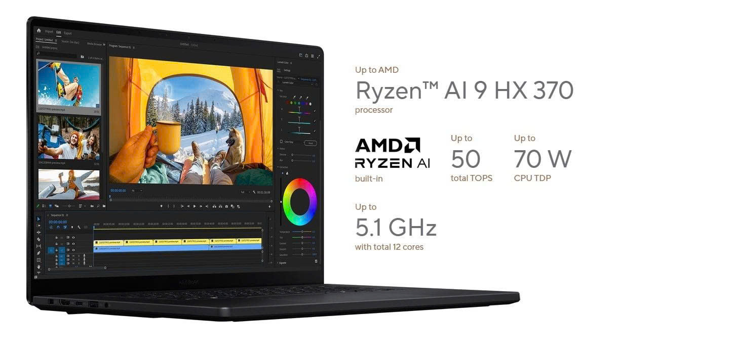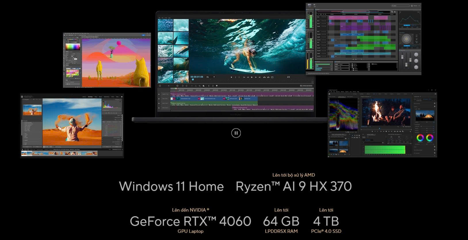 Hãy làm quen với ProArt P16 – người bạn đồng hành sáng tạo tối ưu của bạn trong studio và khi đang di chuyển. Màn hình cảm ứng OLED đảm bảo độ chính xác màu sắc chính xác cho khả năng hiển thị hoàn hảo, đồng thời các cổng I/O linh hoạt kết nối liền mạch tất cả các thiết bị ngoại vi của bạn. Máy tính xách tay được NVIDIA Studio xác nhận này có GPU máy tính xách tay GeForce RTX 40 Series, cung cấp đồ họa mạnh mẽ và hiệu suất AI 321 TOPS. Ngoài ra, nó còn trang bị bộ xử lý AMD Ryzen AI 9 HX 370 50 TOPS, mang lại sức mạnh xử lý vượt trội. Với các tính năng sáng tạo được AI nâng cao, độ bền cấp quân sự và pin lâu dài, ProArt P16 biến mọi bối cảnh thành studio của bạn.