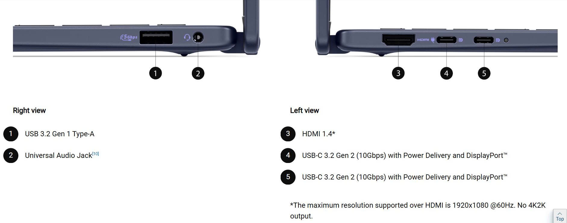 2 USB-C 3.2 Gen 2 (10Gbps) with Power Delivery and DisplayPort™, 1 USB 3.2 Gen 1 Type-A, 1 HDMI 1.4*, 1 Universal Audio Jack
