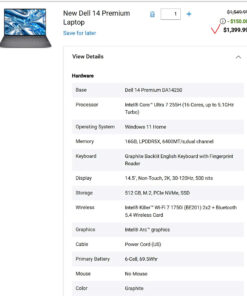 Sở hữu vỏ nhôm nguyên khối chắc chắn và phong cách tối giản, Dell 14 Premium DA14250 có hai phiên bản màu Graphite và Platinum, mang lại sự lựa chọn phù hợp với từng cá nhân. Kích thước 18.00 mm x 320.00 mm x 215.97 mm và trọng lượng chỉ 1.66 kg (2K LCD) hoặc 1.72 kg (3.2K OLED) giúp máy đạt sự cân bằng giữa tính di động và hiệu năng. Nhờ đó, người dùng có thể dễ dàng mang theo trong balo hay túi xách mà vẫn đảm bảo cảm giác chắc chắn và cao cấp.