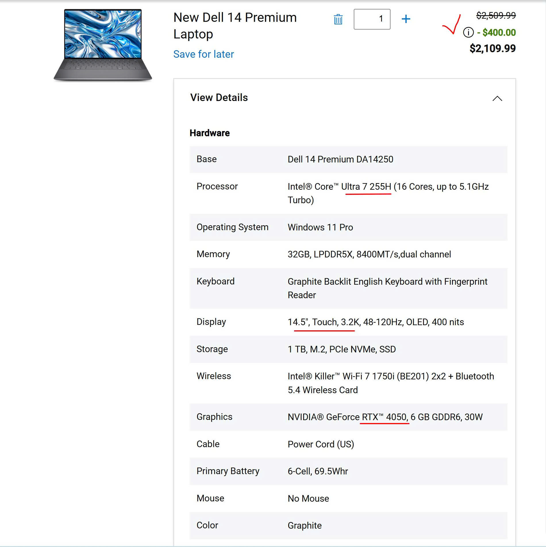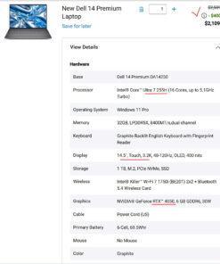 Dell 14 Premium DA14250 / Ultra 7 255H / RTX 4050 / 14.5″,3.2K, OLED, Touch / 32GB / 1TB / Graphite / New – U.S.A