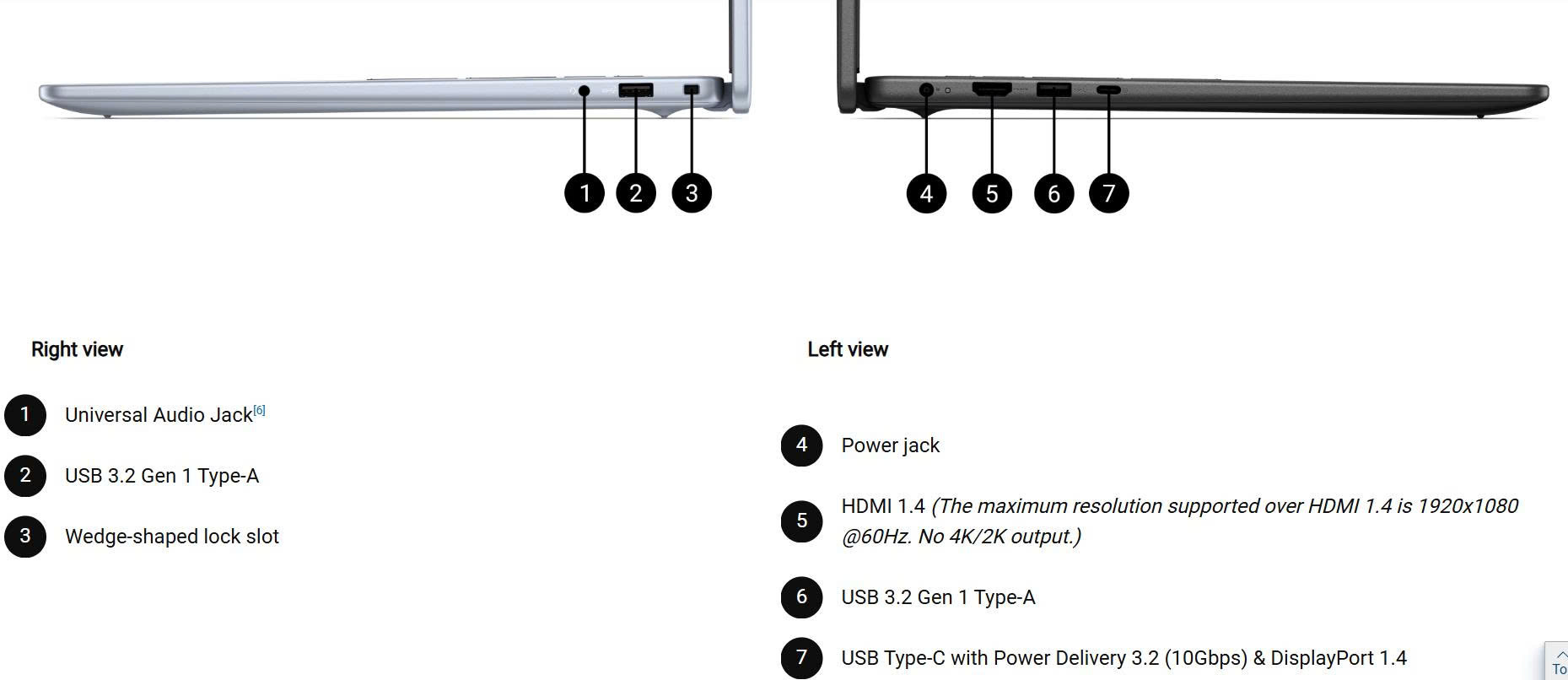 Dell 16 DC16250 được trang bị hệ thống cổng kết nối đủ dùng, đáp ứng hiệu quả cho môi trường làm việc và học tập hiện đại. Các cổng kết nối truyền thống và hiện đại tương đối cân bằng, bao gồm 2 cổng USB 3.2 Gen 1 Type-A, 1 cổng USB 3.2 Gen 2 Type-C hỗ trợ sạc nhanh và xuất hình, 1 cổng HDMI 1.4 và jack tai nghe, đảm bảo kết nối ổn định với hầu hết các thiết bị ngoại vi phổ biến. Máy cũng hỗ trợ chuẩn Wi-Fi 6 và Bluetooth 5.3 mang lại đường truyền ổn định cho học online, họp trực tuyến hay chia sẻ dữ liệu. Nhìn chung, hệ thống cổng của Dell DC16250 được bố trí hợp lý, vừa đủ dùng vừa linh hoạt, đáp ứng trọn vẹn nhu cầu kết nối, trình chiếu và mở rộng thiết bị trong môi trường làm việc hiện đại.