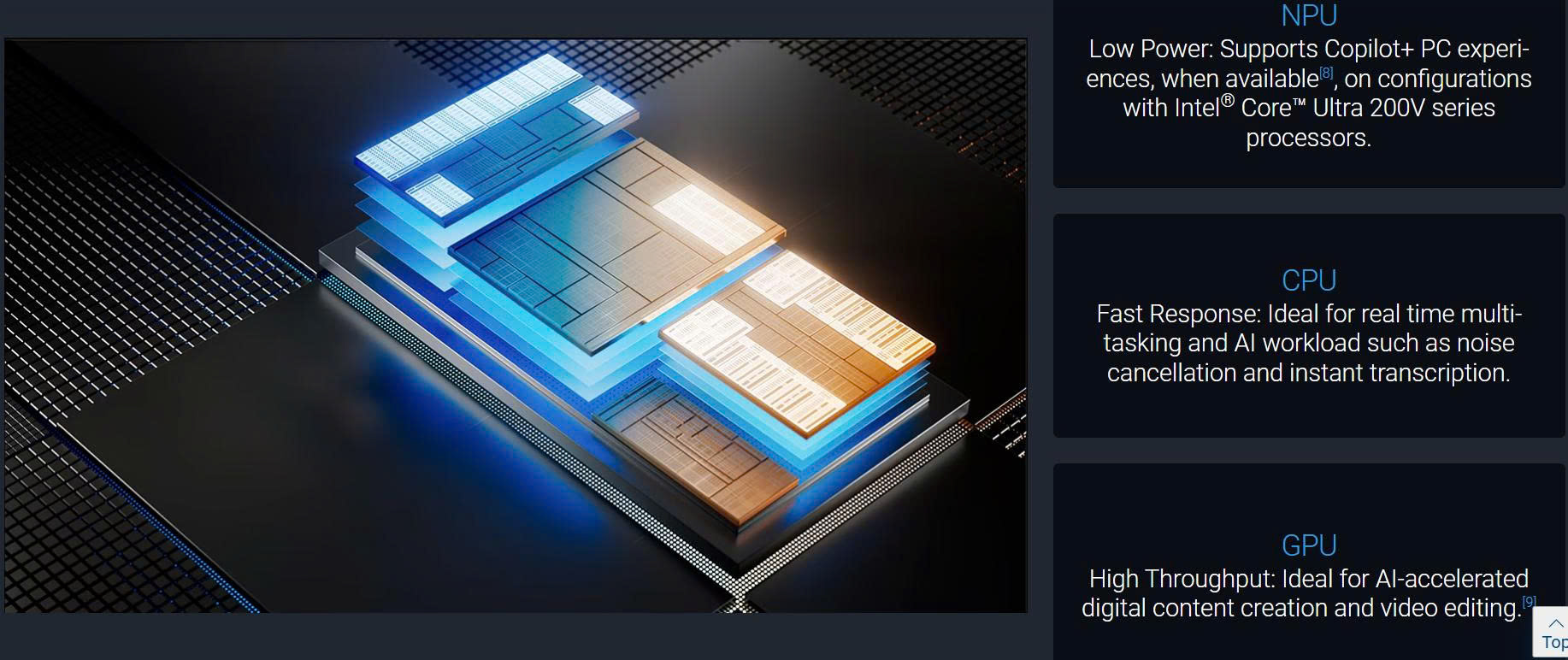 Khai thác hiệu suất vượt trội và thời lượng pin ấn tượng, cùng với trí tuệ nhân tạo mạnh mẽ trên thiết bị, nhờ bộ vi xử lý Intel® Core™ Ultra 200U hoặc 200V series, tích hợp NPU, GPU và CPU.