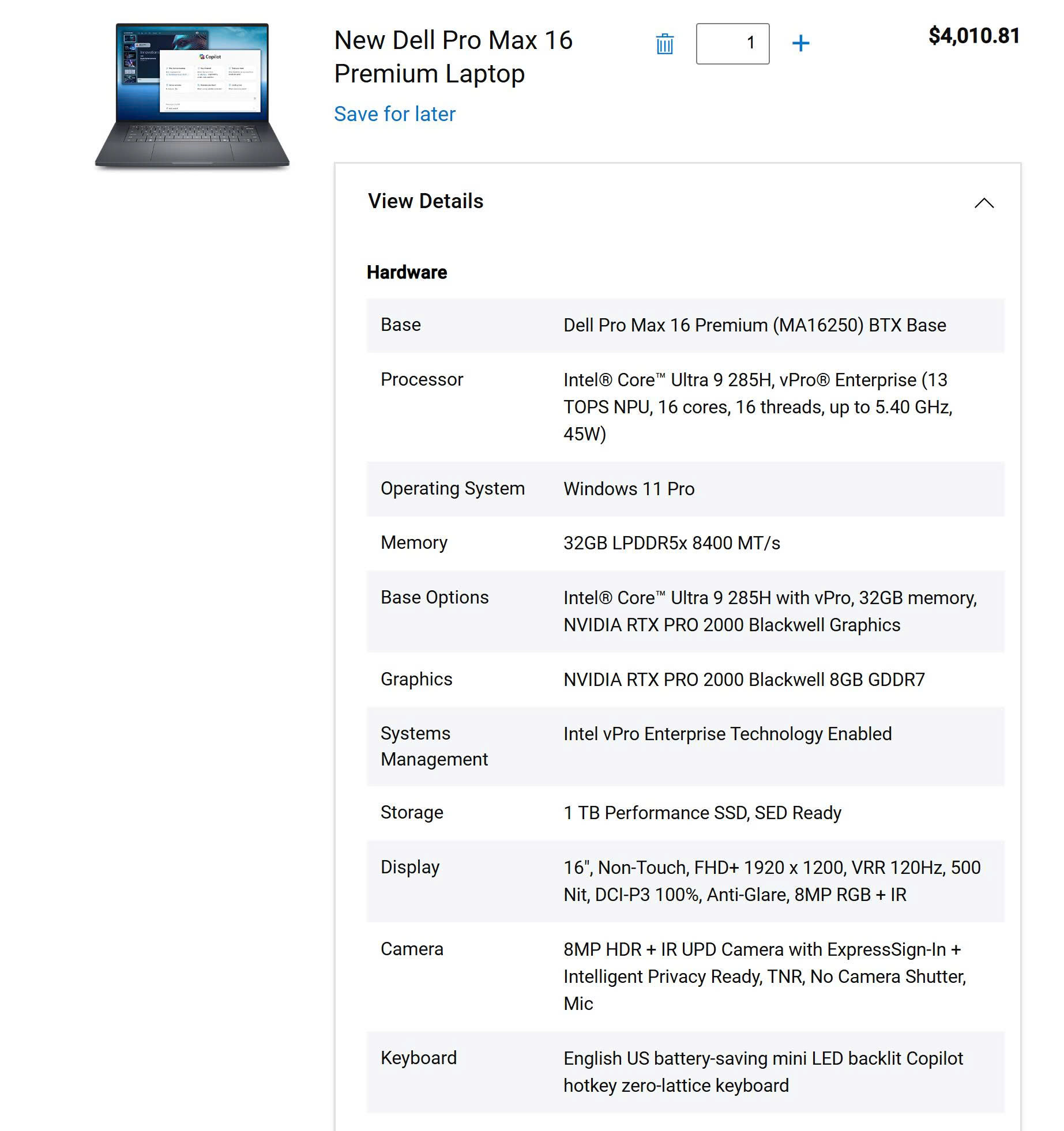 Dell Pro Max 16 Premium / Ultra 7 265H, vPro / RTX PRO 3000 12GB / 32GB / 512GB / FHD+ (1920 x 1200 ) New – From U.S.A