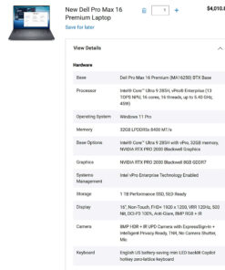 Hệ thống RAM LPDDR5x 8400 MT/s hỗ trợ từ 16GB đến 64GB, kết hợp với ổ cứng SSD PCIe Gen4 dung lượng tối đa 4TB, có thể cấu hình RAID 0 hoặc 1. Cấu hình này đảm bảo tốc độ truy xuất dữ liệu nhanh chóng, ổn định trong các tác vụ đa nhiệm nặng. Tổ hợp phần cứng toàn diện giúp Dell Pro Max 16 Premium MA16250 trở thành một máy trạm di động cao cấp, lý tưởng cho môi trường làm việc chuyên nghiệp yêu cầu hiệu suất bền bỉ và mạnh mẽ.