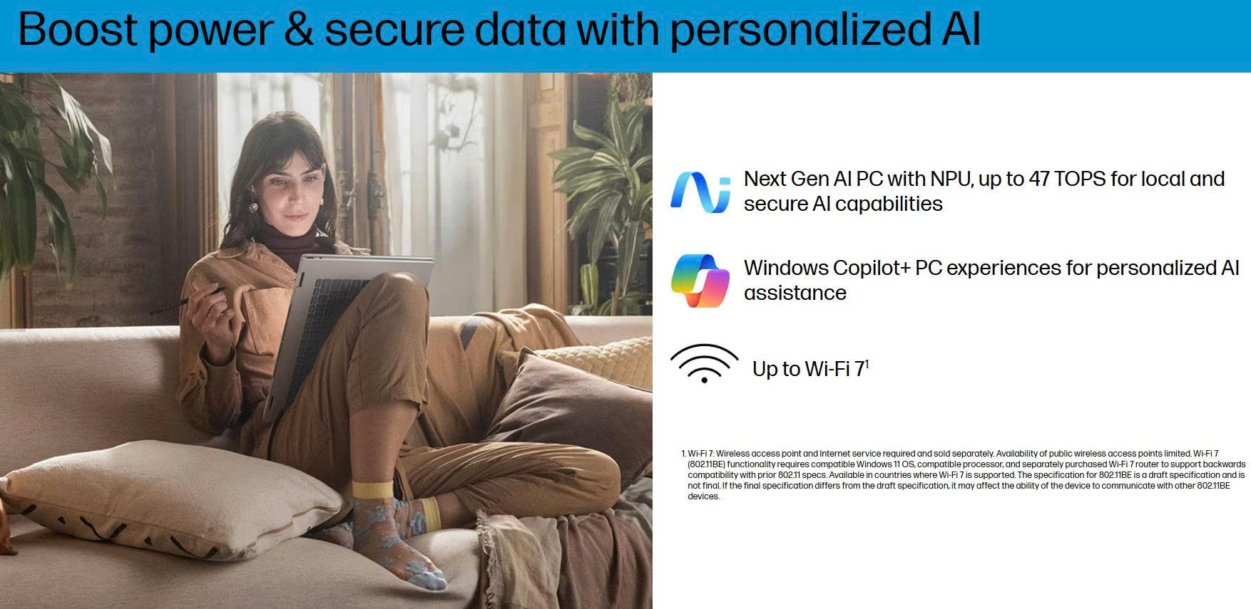 HP OmniBook 7 Flip 2025 sử dụng chip Intel Core Ultra 7 258V, dòng vi xử lý mới tích hợp nhân xử lý AI chuyên dụng (NPU), hỗ trợ tốt cho các tác vụ sử dụng trí tuệ nhân tạo như lọc tiếng ồn, làm mờ hậu cảnh, xử lý hình ảnh và video. Với 12 lõi, tốc độ tối đa 4.8GHz cùng công nghệ AI hỗ trợ tăng tốc, thiết bị xử lý tốt từ công việc văn phòng đến dựng hình 2D/3D và chỉnh sửa video.