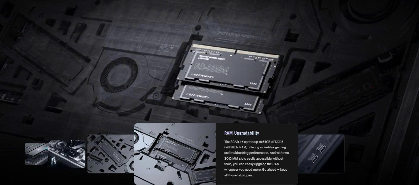 Laptop Asus ROG Strix Scar 16 G635LW được trang bị sẵn 2 thanh RAM DDR5-5600. Với tổng dung lượng RAM lên tới 64GB, mẫu laptop Asus này sẽ trong trạng thái sẵn sàng phục vụ các nhu cầu chơi game, sáng tạo của người dùng. Mỗi khe SO-DIMM của laptop còn hỗ trợ dung lượng RAM tối đa 64GB để người dùng nâng cấp khi cần thiết.