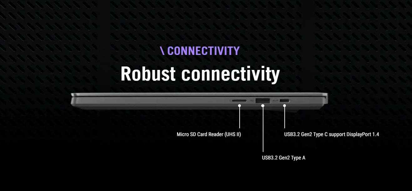 Với RAM LPDDR5X dung lượng 32GB (2x16GB) tốc độ 6400MHz, laptop có khả năng đa nhiệm mượt mà, đảm bảo chạy cùng lúc nhiều ứng dụng nặng mà không gặp bất kỳ độ trễ nào. Ổ cứng SSD PCIe 4.0 dung lượng 1TB cung cấp không gian lưu trữ rộng rãi, đồng thời mang lại tốc độ truy xuất dữ liệu cực nhanh.