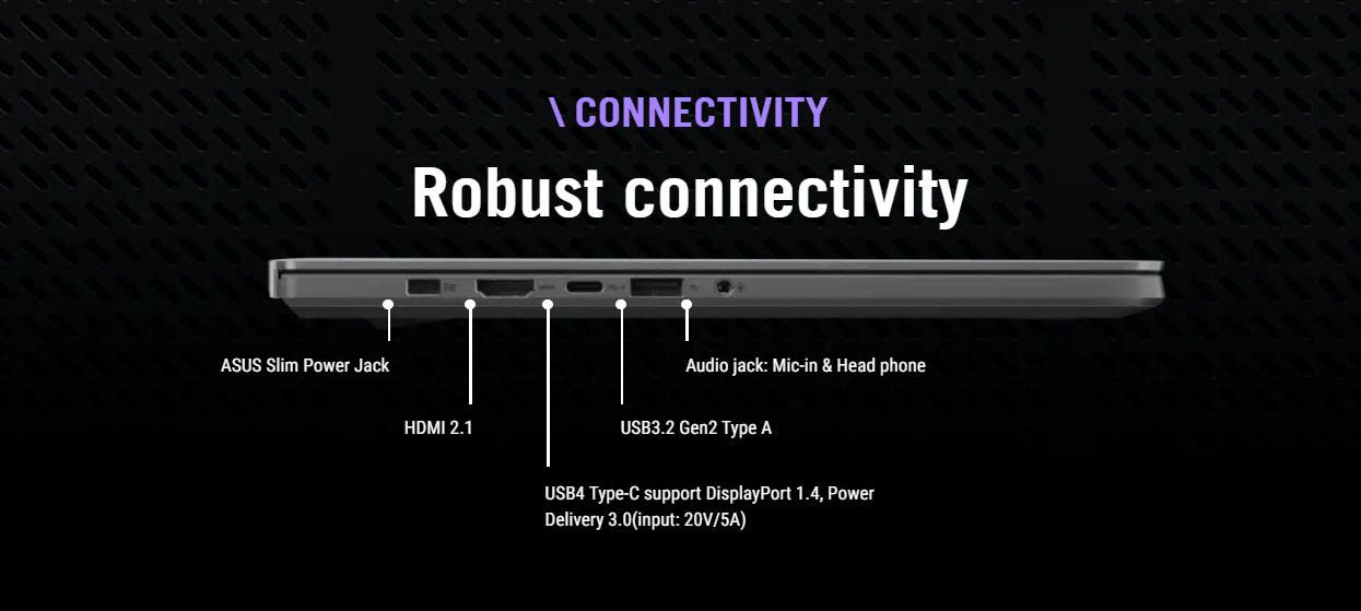 ROG Zephyrus G14 hỗ trợ nhiều cổng kết nối hiện đại như USB-C, USB-A, HDMI 2.1 và giắc cắm tai nghe, mang lại sự tiện lợi khi kết nối với các thiết bị ngoại vi. Kết nối Wi-Fi 6E và Bluetooth 5.2 đảm bảo tốc độ truyền tải nhanh và ổn định.