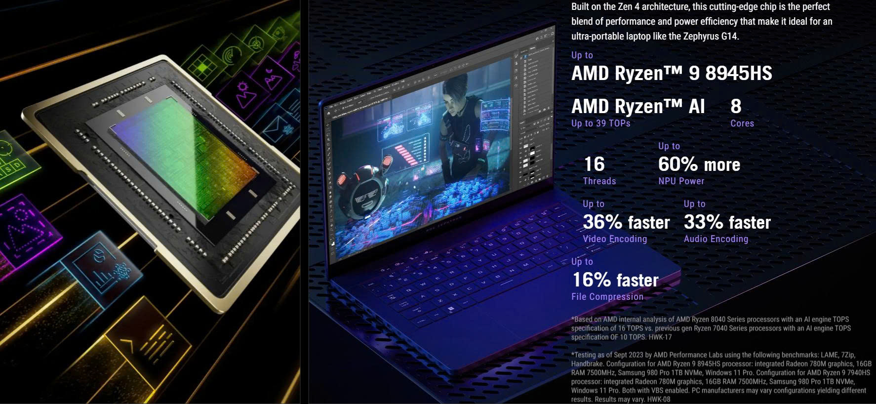 ROG Zephyrus G14 được trang bị CPU AMD Ryzen 9 8945HS, với 8 nhân, 16 luồng, tốc độ xung nhịp tối đa lên tới 5.2GHz và bộ nhớ đệm 24MB. Kết hợp với AMD XDNA NPU, máy hỗ trợ tối đa các tác vụ AI với khả năng xử lý lên đến 16 TOPS, tối ưu hóa hiệu suất làm việc và chơi game.