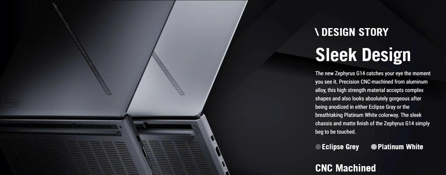 Thay đổi hoàn toàn ngôn ngữ thiết kế truyền thống, Zephyrus G14 2025 khoác lên mình bộ vỏ nhôm nguyên khối được chế tác tỉ mỉ bằng công nghệ CNC chính xác. Với phiên bản màu Trắng Bạch Kim (Platinum White) đầy cuốn hút, chiếc máy toát lên vẻ sang trọng, thanh lịch, dễ dàng hòa nhập vào mọi môi trường chuyên nghiệp. Thiết kế siêu mỏng nhẹ với trọng lượng chỉ 1.5 kg và độ mỏng 1.59 cm biến G14 trở thành người bạn đồng hành di động lý tưởng, phá vỡ định kiến về một chiếc laptop gaming cồng kềnh.