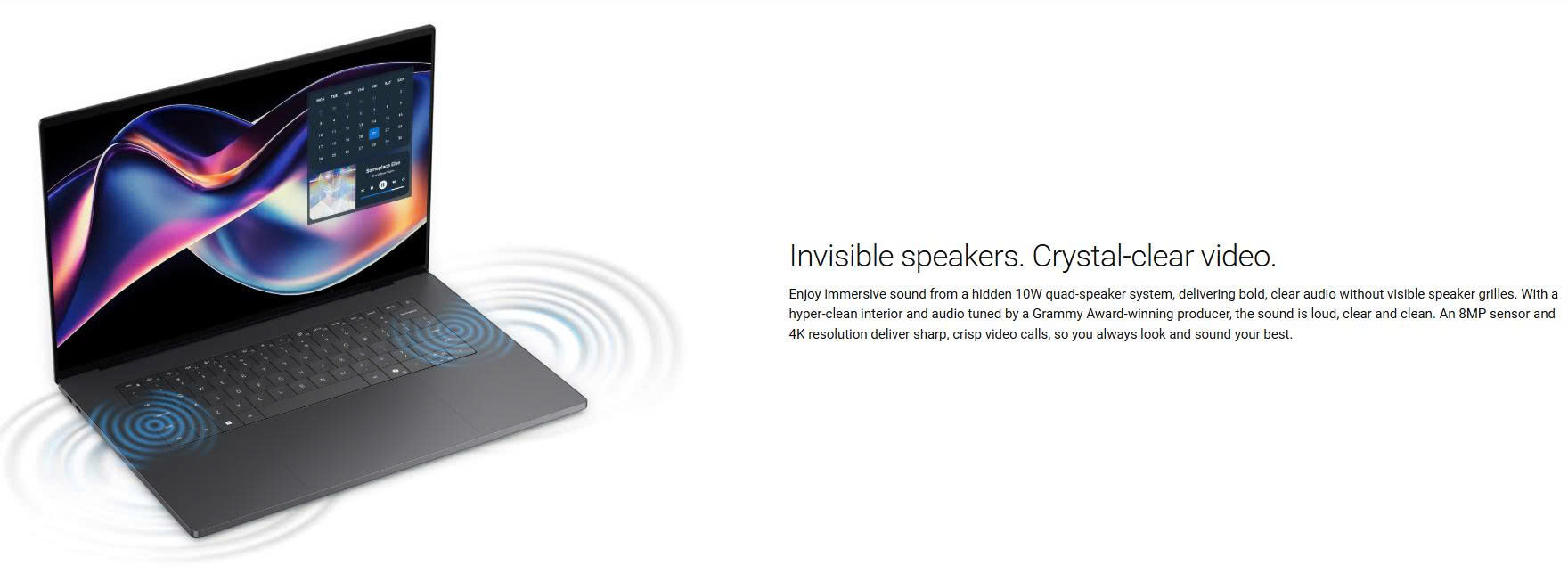 Âm thanh luôn là yếu tố quan trọng trong trải nghiệm tổng thể của một chiếc laptop cao cấp. DELL XPS 16 DA16260 được trang bị hệ thống loa Quad-speaker tích hợp công nghệ Waves MaxxAudio® MaxxVoice, cùng các bộ xử lý âm thanh theo chuẩn Studio, đem lại chất lượng âm thanh hấp dẫn, rõ ràng, trung thực như phòng thu.